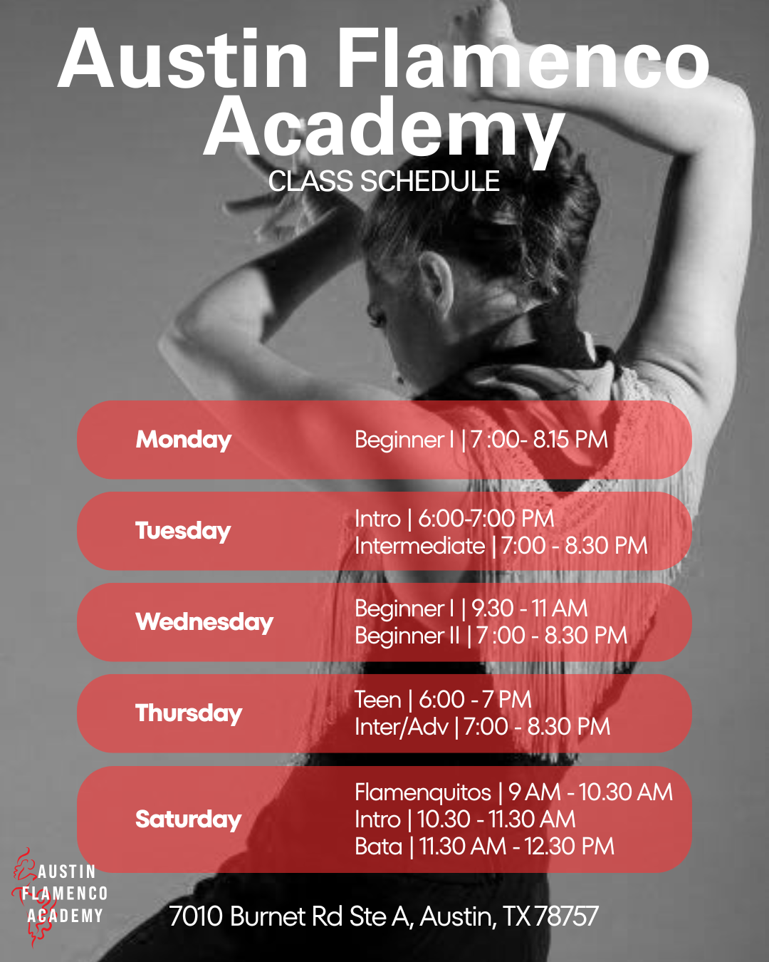 Austin Flamenco Academy has classes for all levels. Each class focuses on technique and choreography of the various palos of flamenco.